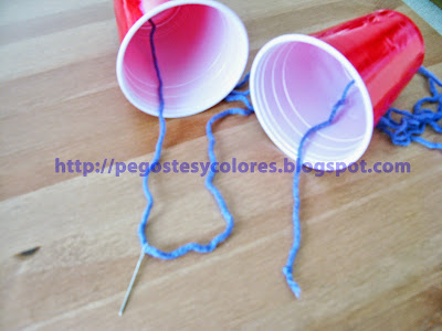 2.- Introducir un extremo de estambre metiéndolo al vaso, en esta parte los niños pueden ayudar, porque sus manos pequeñas caben mejor que las nuestras. Podemos auxiliarnos con una aguja estambrera y hacer un nudo grueso o doble para que al jalar de nuevo no se salga (o sea que al jalar el nudo quedara dentro del vaso).