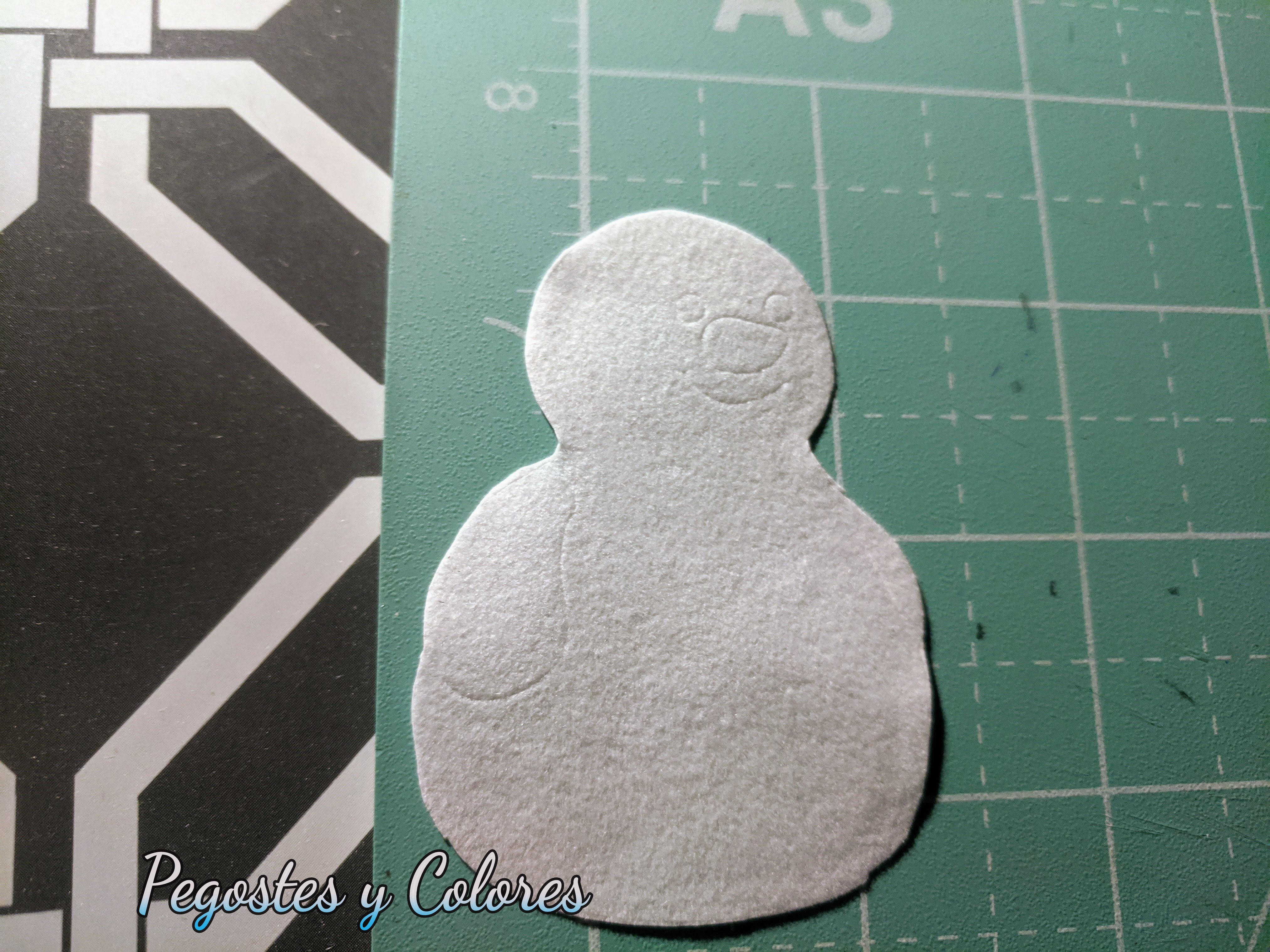 Volteamos todo cuidando que no se mueva el die cut y tallamos con cuidado con una piedra haciendo énfasis en la orilla hasta que se empiece a notar la figura, pero también pasando con cuidado dentro de la figura para que se noten los detalles como los ojos, nariz y boca (recuerda que se talla por el lado que no tiene el terciopelo). Entre mas tallamos se ira cortando la pieza. O tambien puedes parar cuando se marque bien y luego con la tijera cortar por la orilla marcada. Eso si, los pinos me costaron mas trabajo recortarlos, so demasiados detalles. Espero en un futuro poder comprarme la maquina para poder hacer esto mas facil. Pero de momento fue una buena solución,